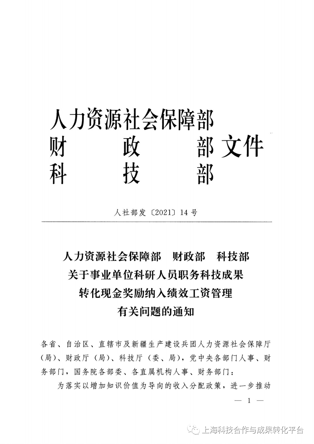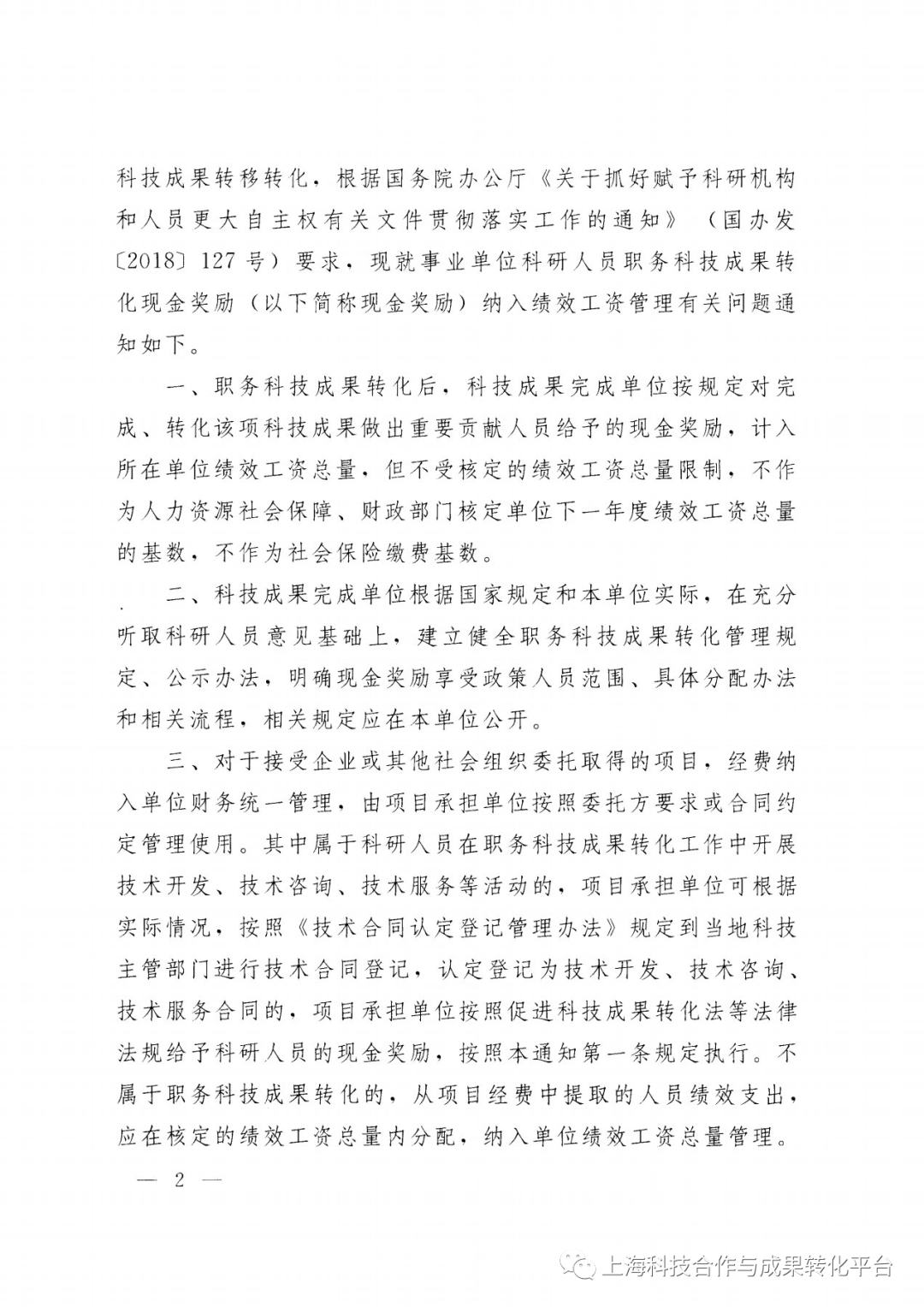 关于事业单位科研人员职务科技成果转化现金奖励纳入绩效工资管理有关问题的通知